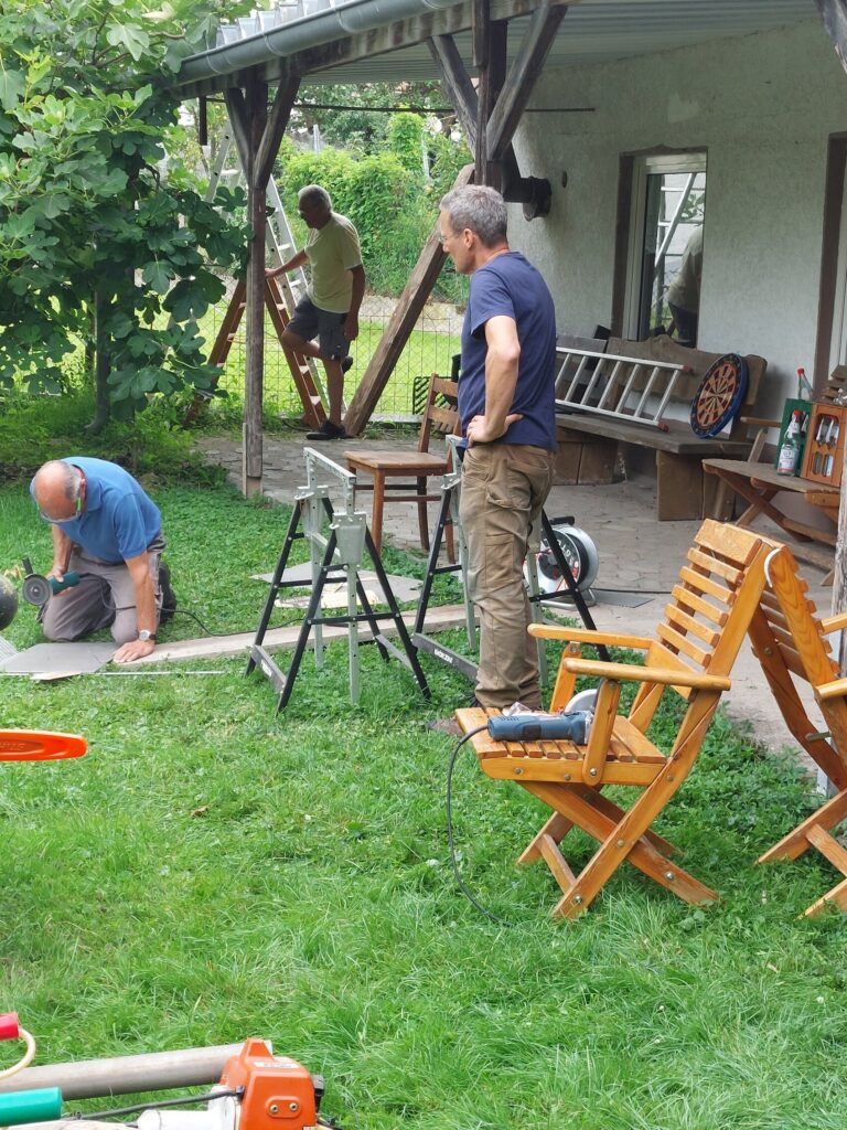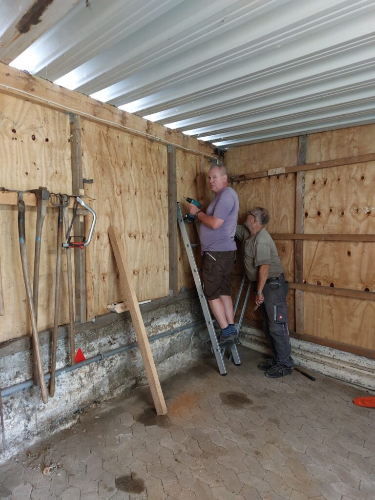 Ein Trupp kümmerte sich um den Geräteschuppen, der aus- und aufgeräumt wurde. Es wurden unbrauchbares Holz, Eisenteile und uralte Prospekte und Broschüren entsorgt. Für die motorgetriebenen Geräte wurde ein Regal montiert. Der Schuppen wurde gereinigt und die Geräte sauber und übersichtlich eingelagert.