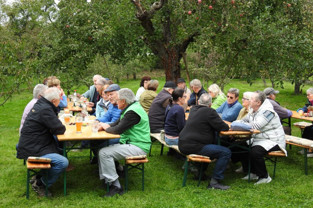 Bei gut gekühltem Apfelwein saßen die ca. 20 Kursteilnehmer unter dem Vordach des Vereinsheims und sprachen noch länger über Baumpflegearbeiten und Probleme die es mit einzelnen Bäumen gibt.